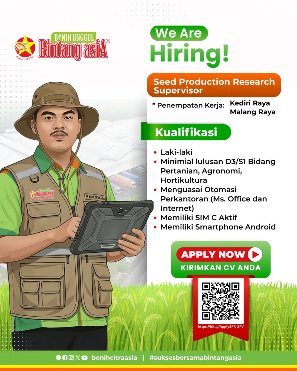 Benih Unggul Bintang asiA. Terima kasih atas kepercayaan pelanggan pengguna dan penyalur produk Bintang asiA atas kesetiaannya pada produk Bintang asiA. Tim Riset PT. Benih Citra Asia terus bekerja keras dalam meneliti dan mengembangkan varietas-varietas baru yang lebih unggul, produksi tinggi, umur genjah, tahan hama penyakit serta virus, tahan cuaca ekstrim, tahan transportasi jarak jauh dan kemudahan dalam budidaya.