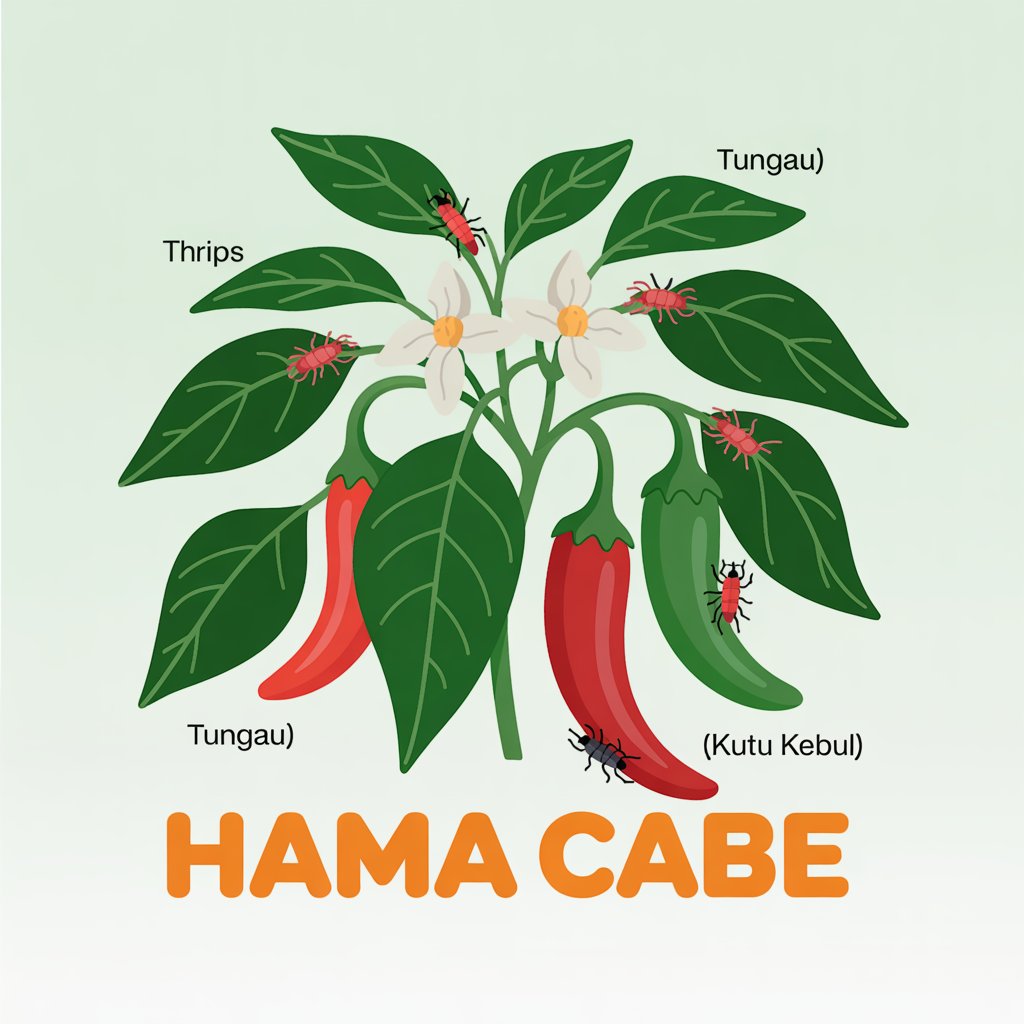 Thrips adalah serangga mungil berwarna putih, kuning, atau hitam yang menyerang daun, bunga, dan buah cabai dengan cara mengisap cairan tanaman. Serangan hama ini bisa menyebabkan daun menggulung, bunga rontok, dan buah tampak cacat. Thrips tergolong hama polifag yang dapat menyerang berbagai jenis tanaman.