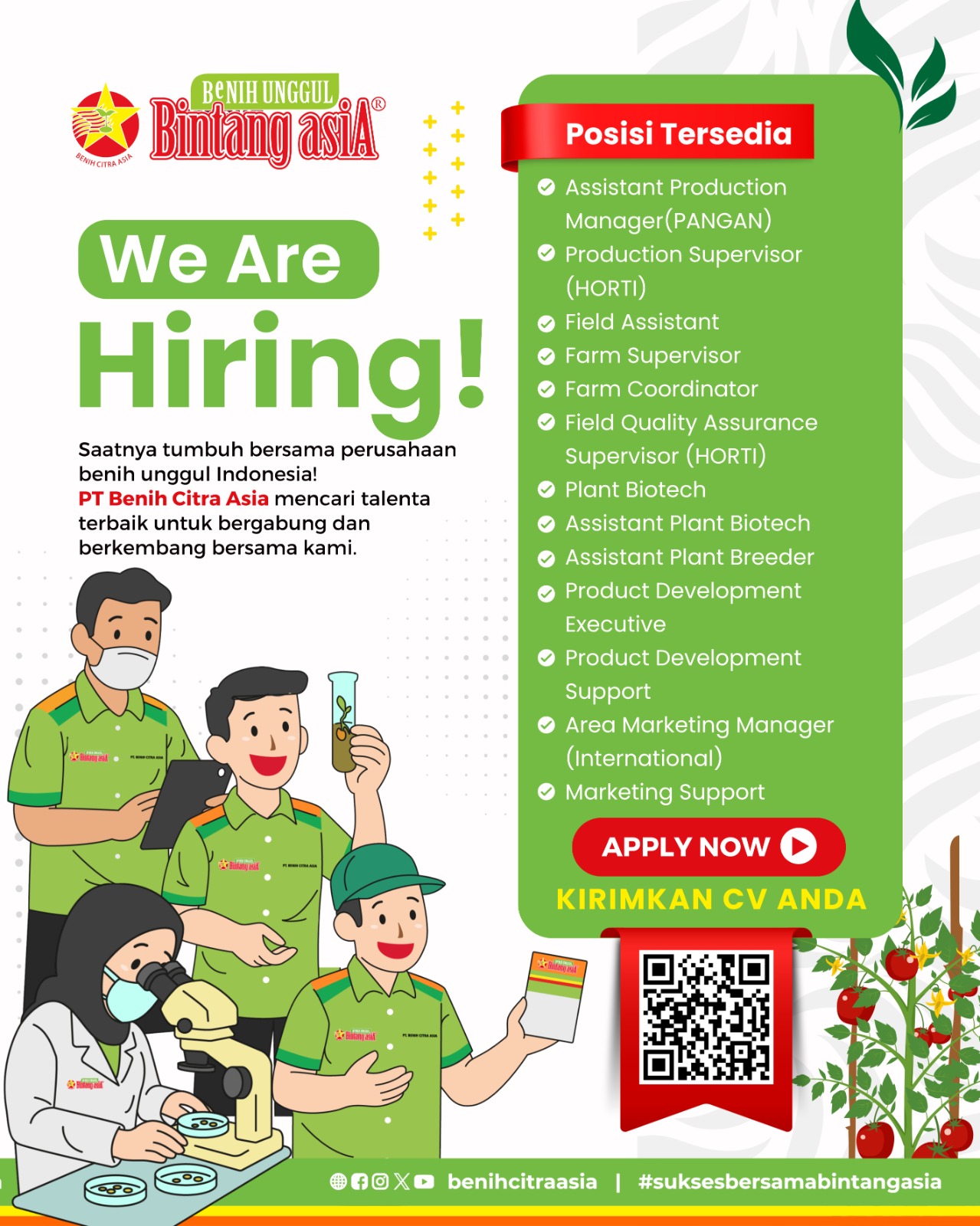 Bergabunglah dengan PT Benih Citra Asia (Bintang Asia), kembangkan potensi terbaikmu, dan jadilah bagian dari masa depan pertanian yang lebih produktif dan berkelanjutan!